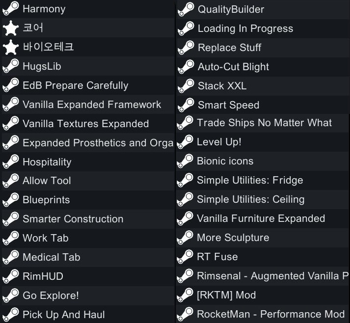 만약 자신이 림월드를 처음 플레이하거나 어떤 모드를 설치해야 할지 모르겠다면 바닐라로 하는 것도 좋지만 아래 모드들만 추가해도 쾌적하게 즐길 수 있다.